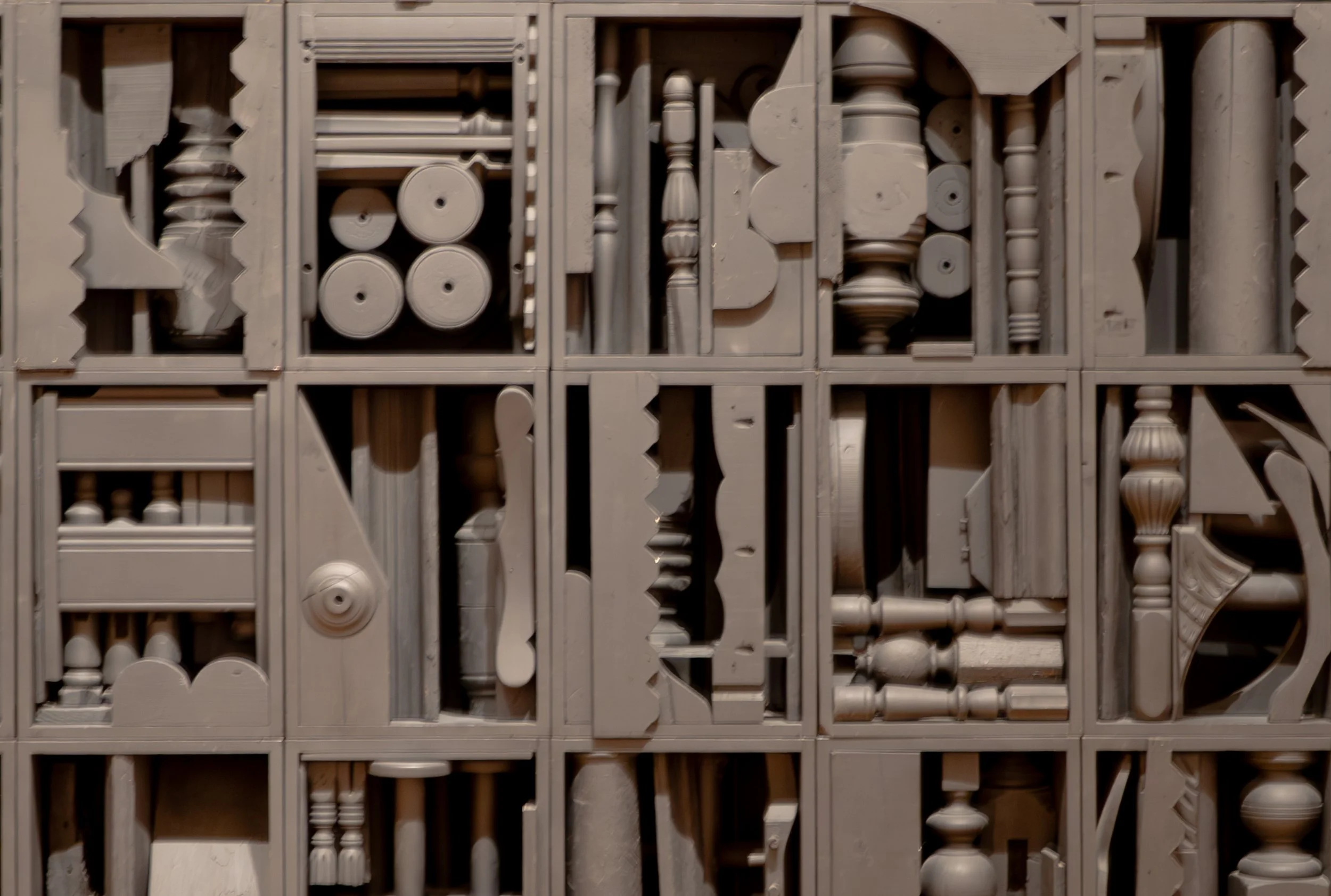 To create this sculpture, Nevelson stacked boxes against a wall and filled each compartment with found wooden scraps including moldings, dowels, spindles, and furniture parts. She then covered the entire assemblage with black paint, both unifying the composition and obscuring the individual objects.