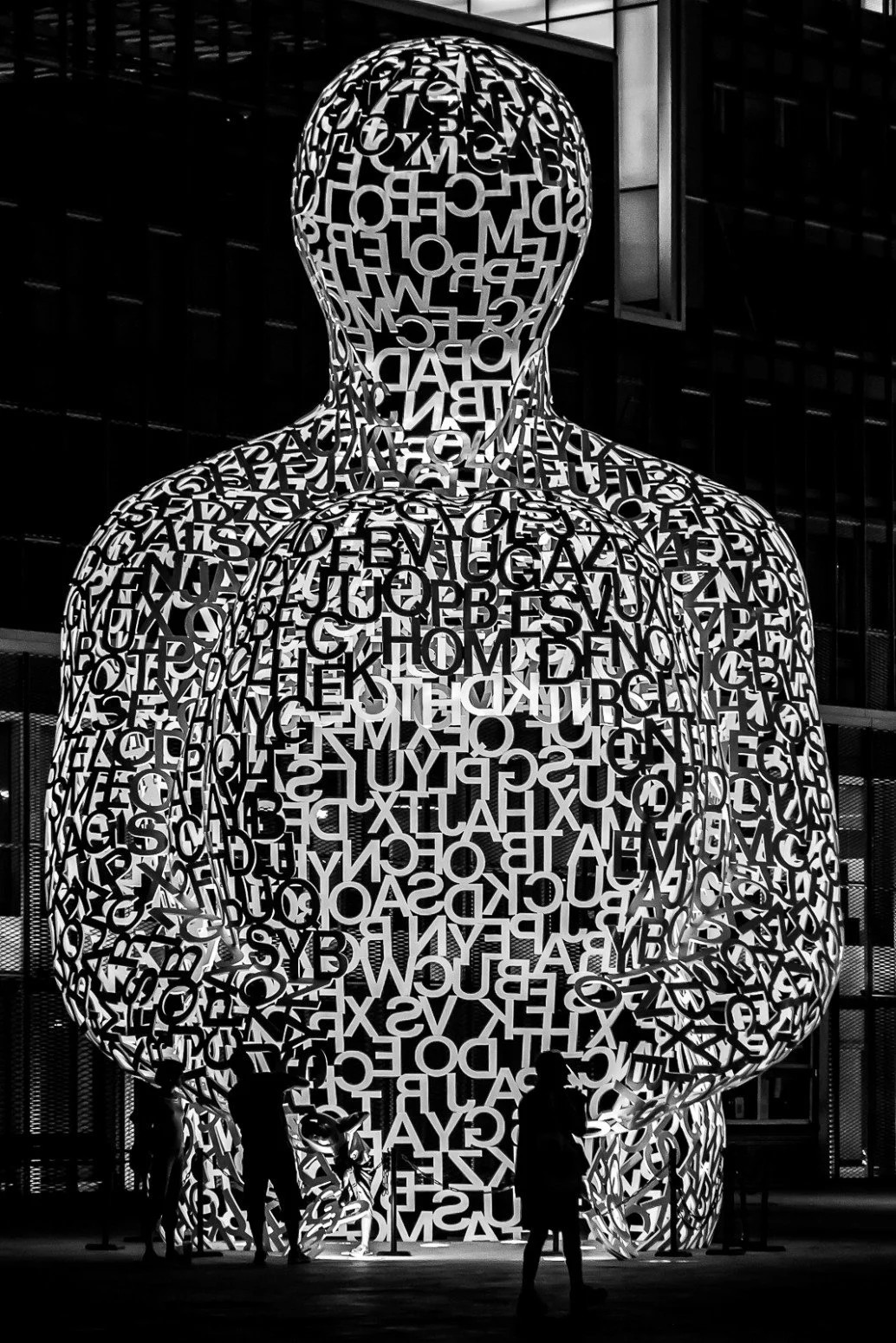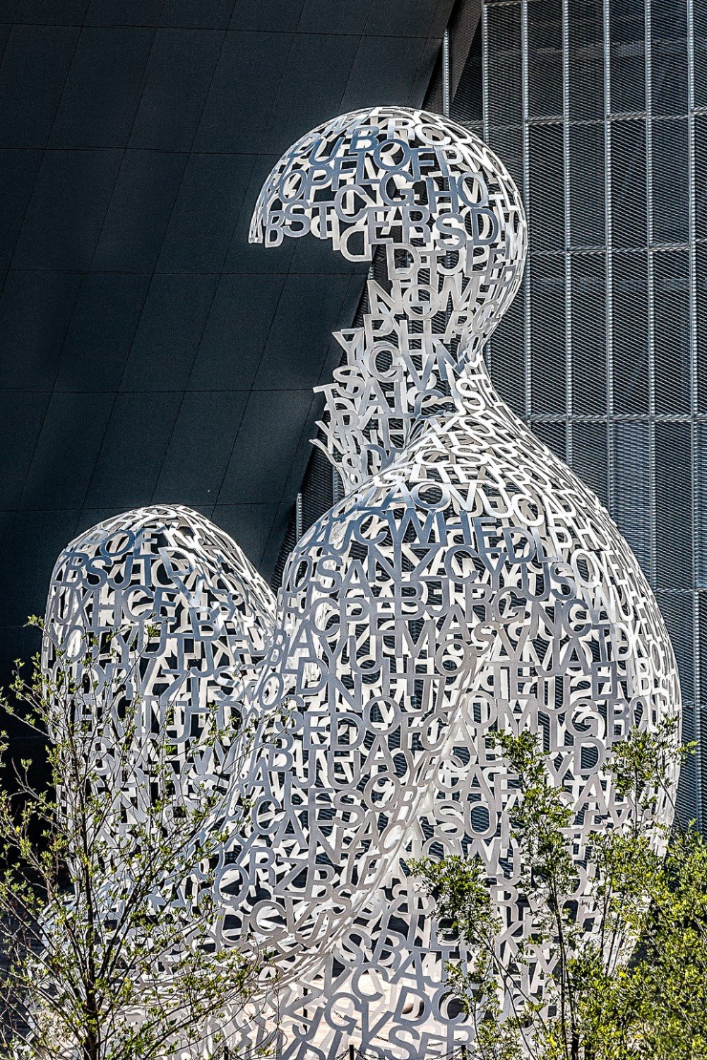 It is eleven meters high, the sculpted letters representing cells of the human body which is over 60% water. Its white letters and hollow structure invite the viewer to look inside and reflect on the relationship between human beings and water.